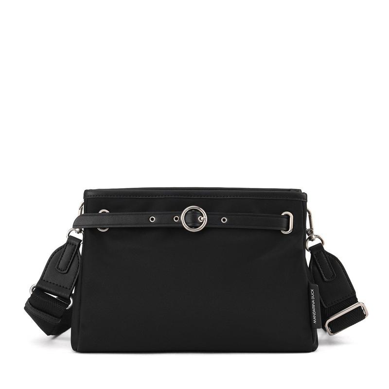本体上部にはプラスチックのスナップボタン、前面にはファスナーを付けているので、中身の飛び出しを防ぎます。